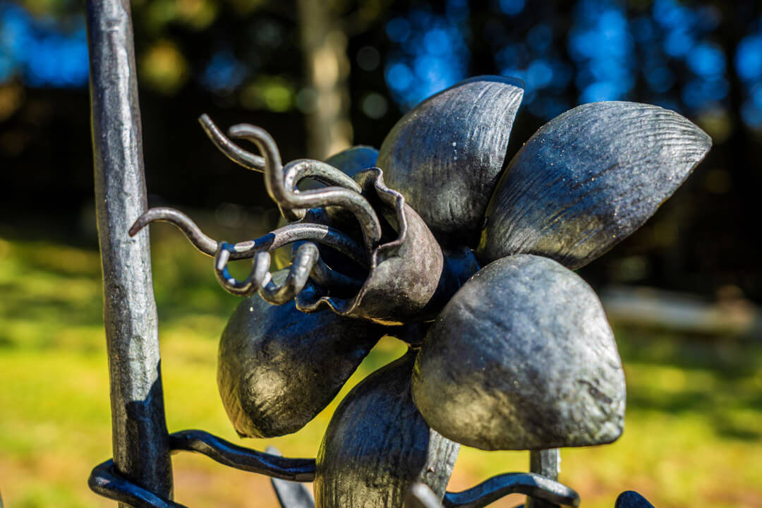 This commission was made over the course of a few months, whilst juggling some other jobs. It is a fence to keep the dog from jumping up and down over the wall, with a gate for garden access. It is a follow on piece from ‘the meadow gate’, incorporating some of the design aspects and developing new ones. The brief was to make the piece in the same style as ‘the meadow gate’, but “more Alice In Wonderland” and “Little Shop of Horrors”, incorporating some specific plants of the clients choice.